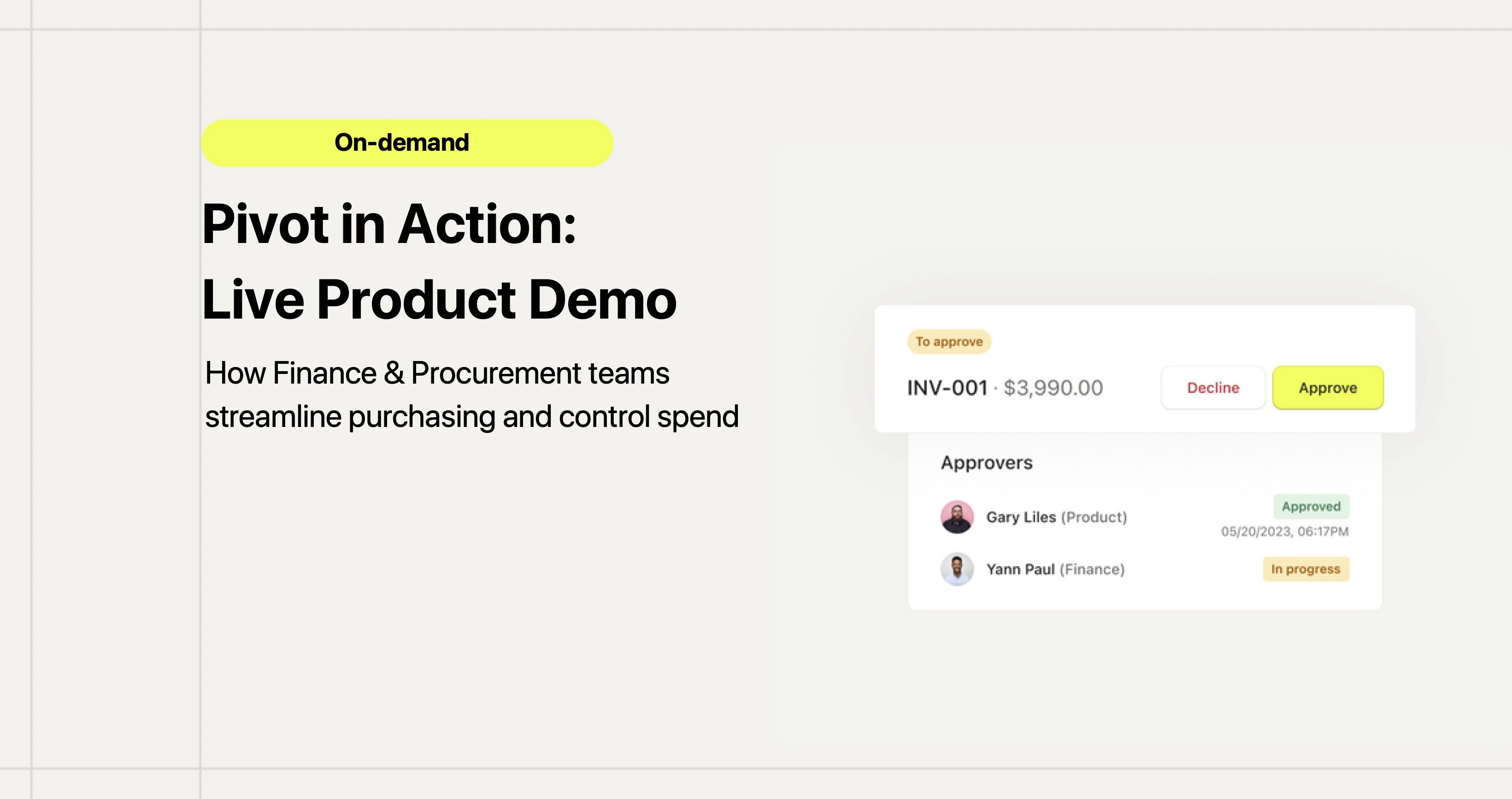 Join our 45-minute live demo to discover how Pivot helps finance and procurement teams control spend, streamline intake, and automate approvals. In each monthly session, our solution experts will walk you through the product and answer your questions live.